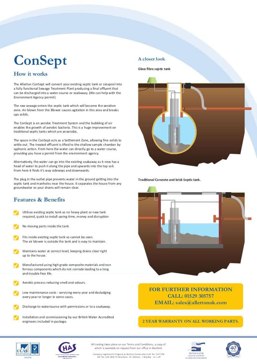 The Allerton ConSept will convert your existing septic tank or cesspool into a fully functional sewage treatment system producing a final effluent that can be discharged into a watercourse or soakaway.¹
