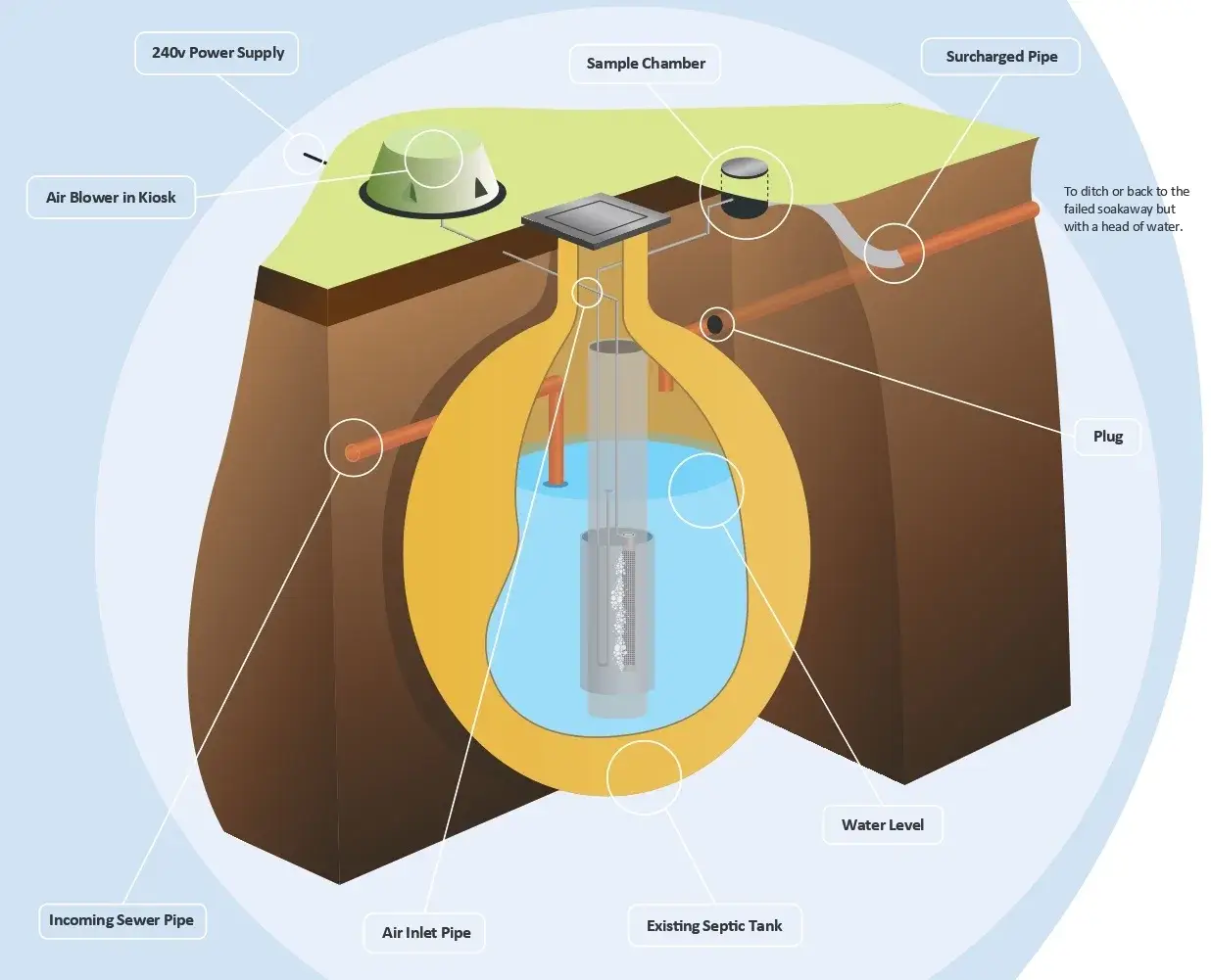 The Allerton ConSept is an aerobic treatment system and the bubbling air encourages the growth of aerobic bacteria. This is a huge improvement on traditional septic tanks which are anaerobic.
